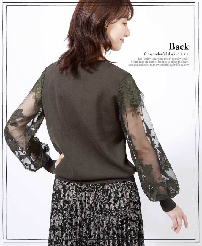 【カーキグリーン】重なる肩レースと ふんわりチュールの袖花刺繍トップス【da10108】レディース トップス カットソー ニット カジュアル 綺麗め レース チュール 刺繍