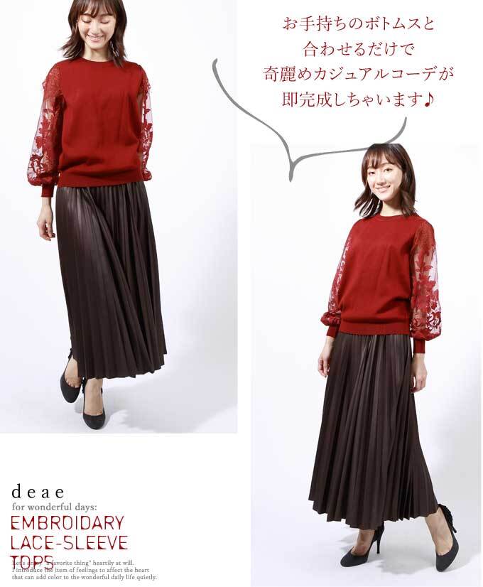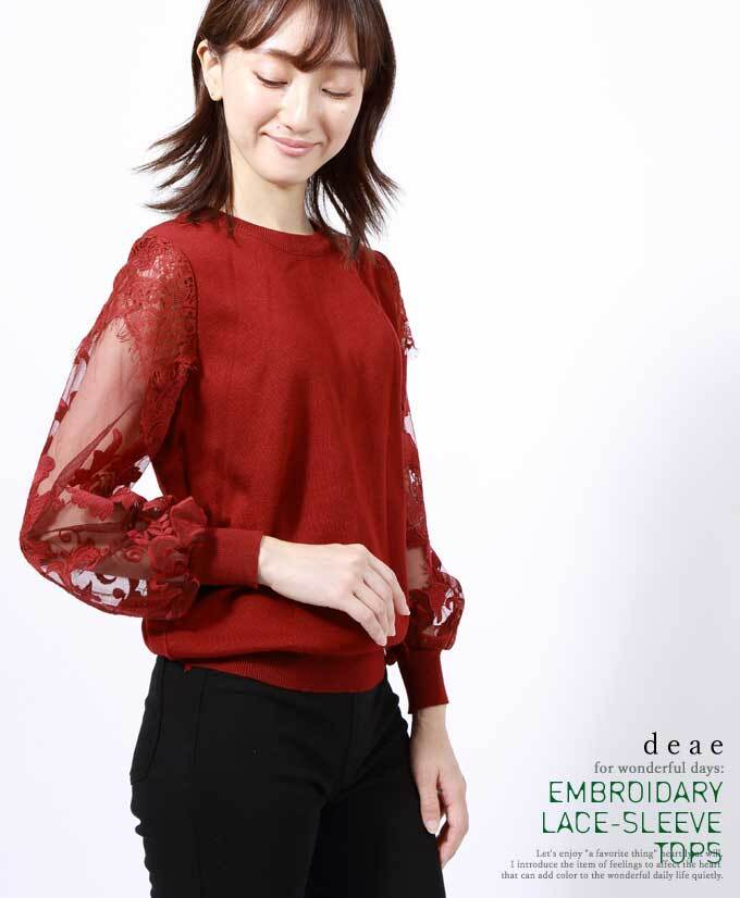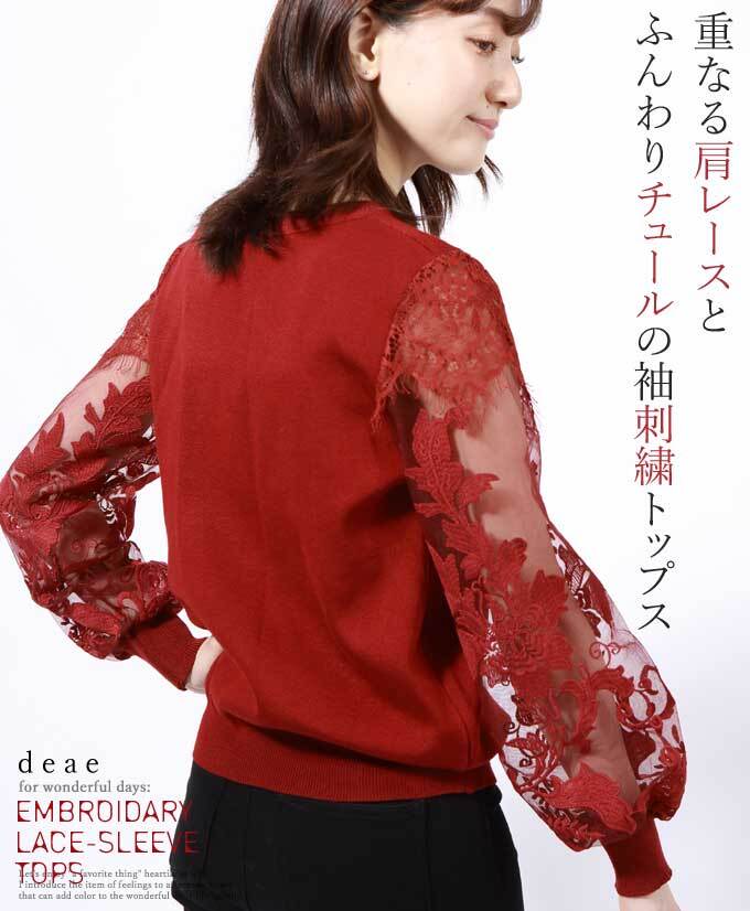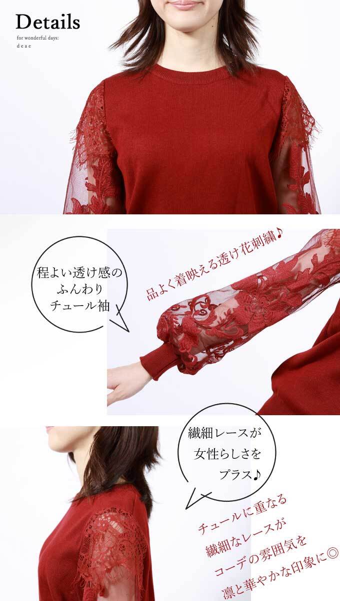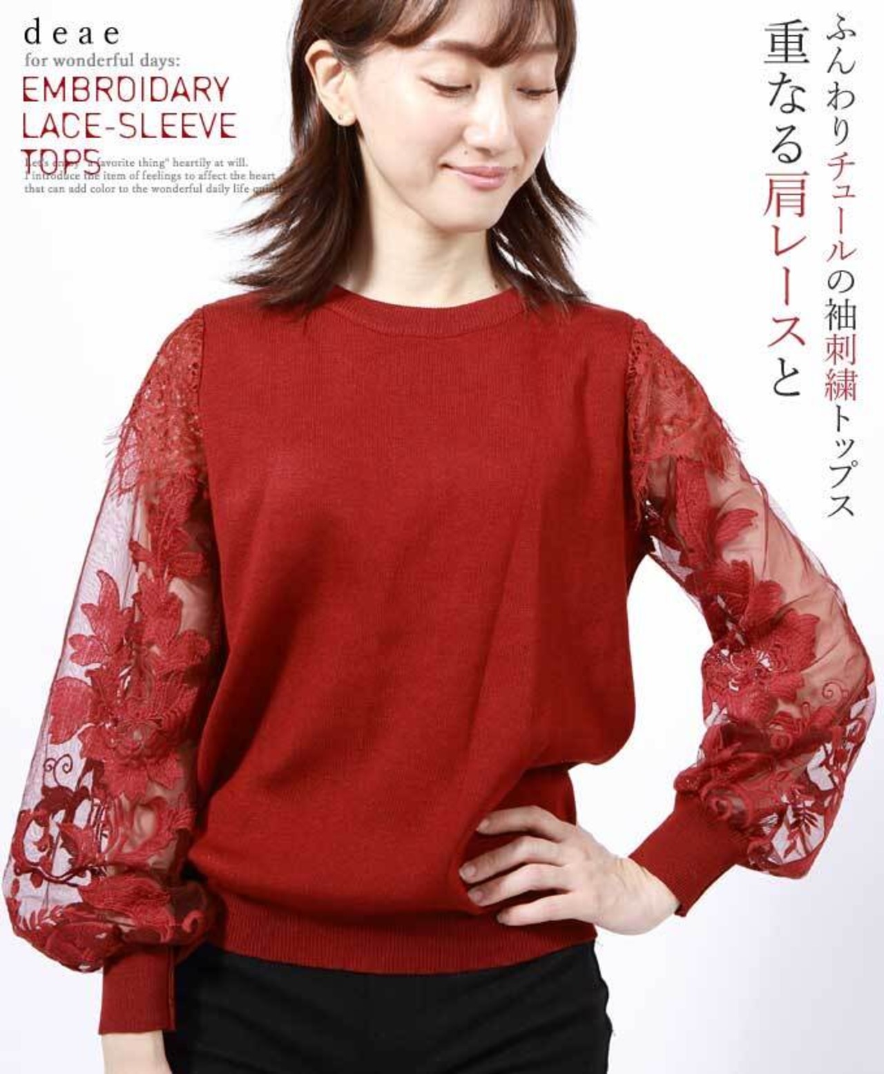 【レッド】重なる肩レースと ふんわりチュールの袖花刺繍トップス【da10110c】レディース トップス カットソー ニット カジュアル 綺麗め レース チュール 刺繍