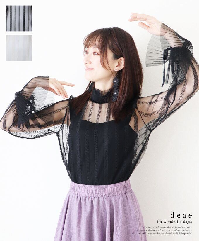 トップス カットソー チュール レース シアー レディース 長袖 フェミニン カジュアル 上品 きれいめ 綺麗め ブラック ライトベージュ 30代 40代 50代 60代【da10125】 | deae