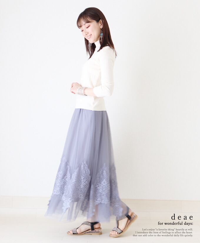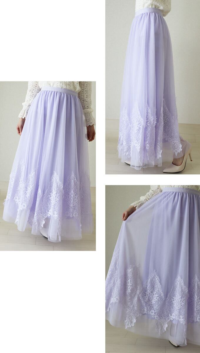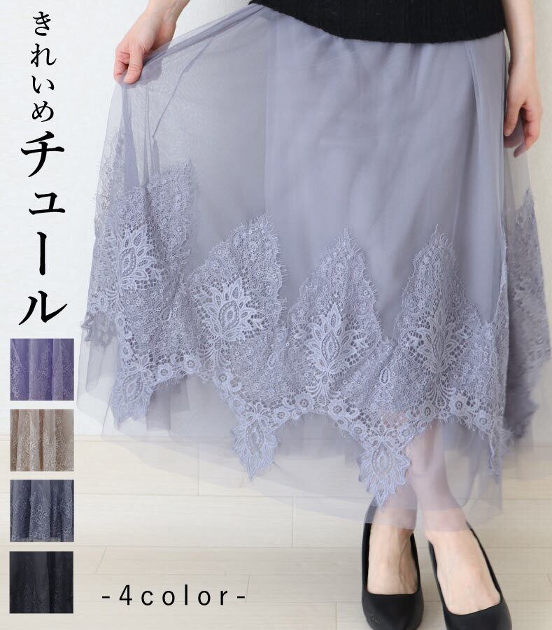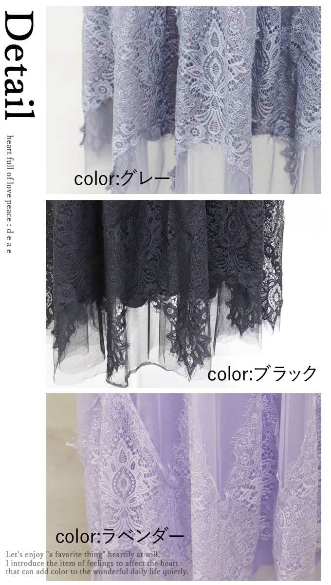 スカート チュール ロング丈 たっぷりフレア 繊細レース レディース ファッション 【ブラック グレー ベージュ ラベンダー】 大人 カジュアル お洒落 愛い 着回し ナチュラル 華やか レイヤード 「纏うだけで華やぐ 繊細レースのチュールスカート」【dc10111】 | deae