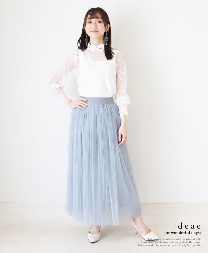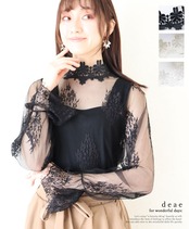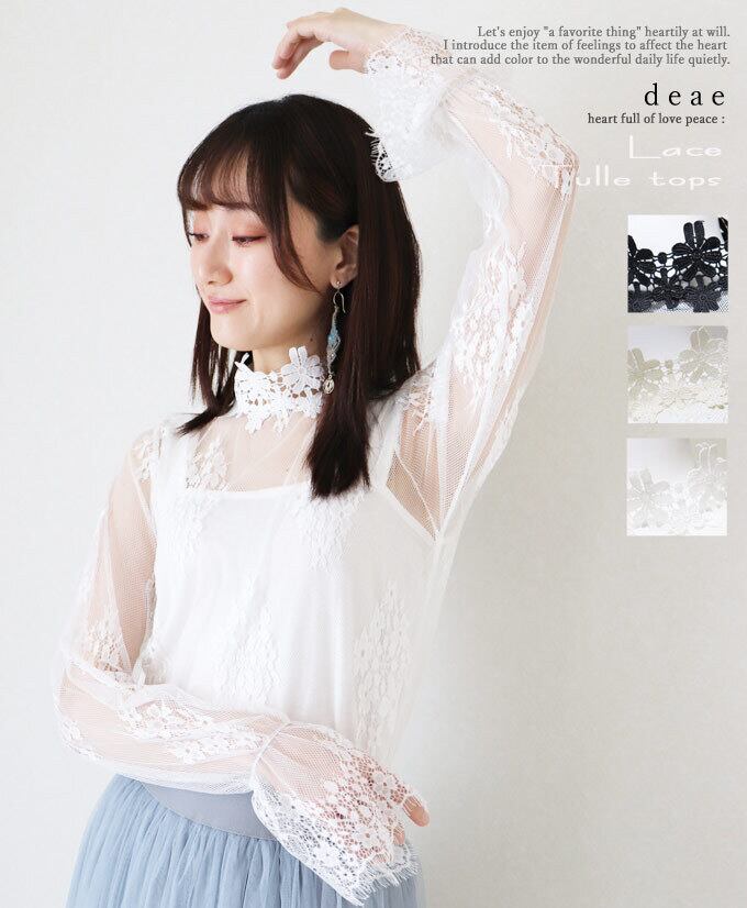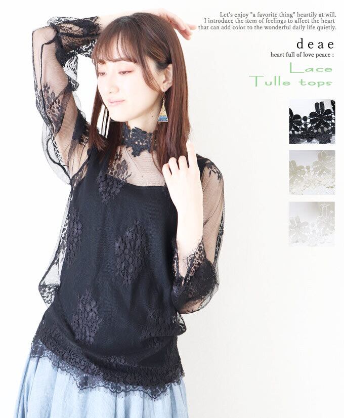 トップス カットソー チュール 花レース シアー レディース 長袖 フェミニン カジュアル 上品 きれいめ 綺麗め【 ブラック・ クリーム・ ホワイト】 30代 40代 50代 60代【da10124】 | deae