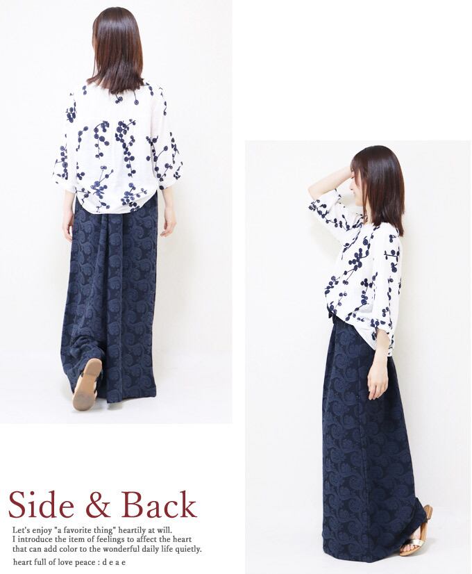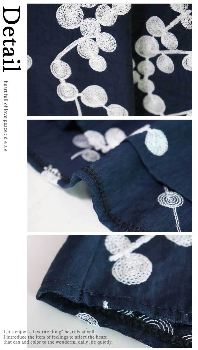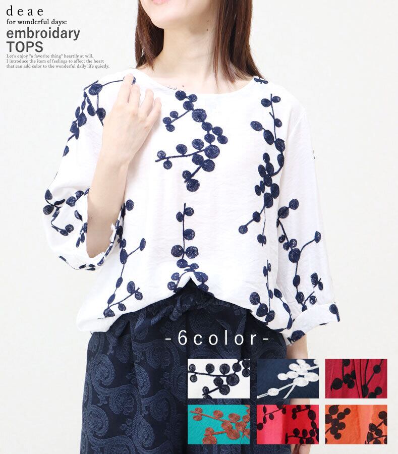 トップス カットソー 七分袖 草木刺繍 北欧風 水玉 ドット レディース カジュアル ホワイト ネイビー ワイン グリーン レッド オレンジ 30代 40代 50代 60代 【da10129】 | deae