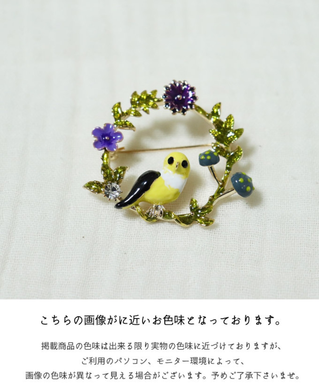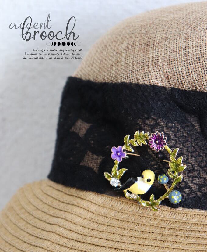 D.E.A.Eインコと花の環ブローチ/差し色/北欧/煌めくブローチ/かわいいブローチ/カラフル/ブルー/青/イエロー/パープル/鳥/インコ/きのこ/アクセント/ビジュー/ 【pb706】 | deae