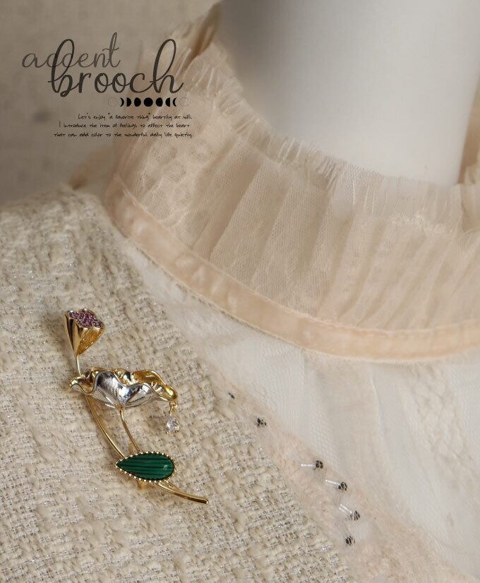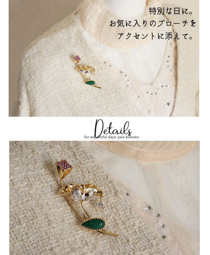 D.E.A.E 蓮の花と雫ビジューのブローチ/差し色/北欧/煌めくブローチ/かわいいブローチ/金/ゴールド/雫/植物/アクセント/ビジュー/蓮の花/上品/フォーマル/ロータス/揺れるビジュー/【pb712】 | deae