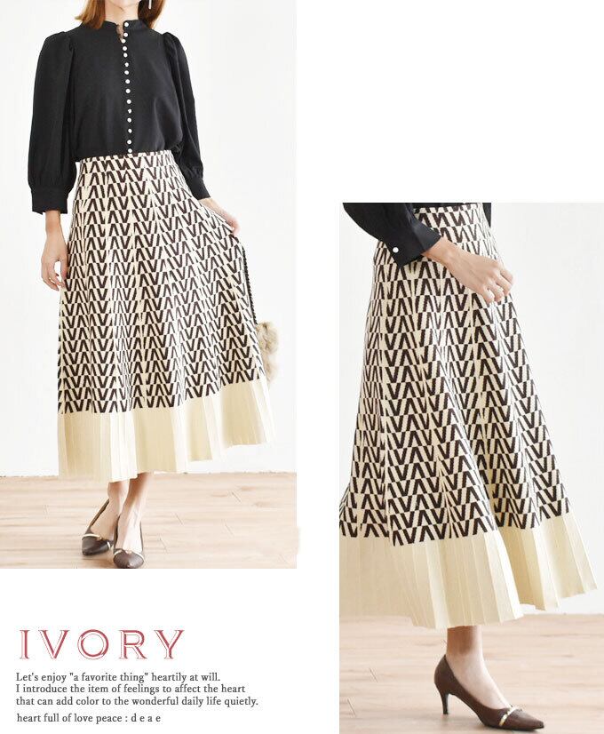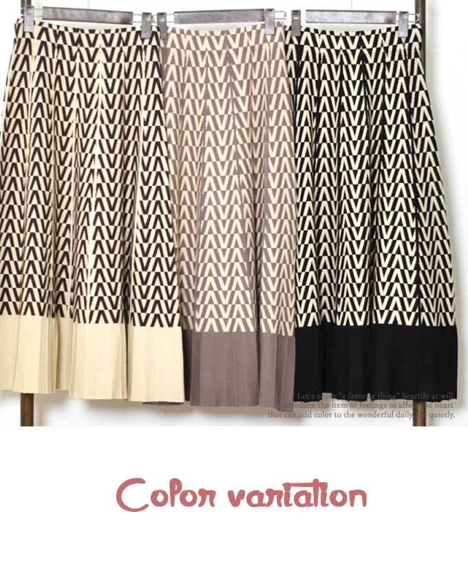 スカート ニット 幾何学柄 プリーツ調 上品 エレガント カジュアル Aライン フレア レディース ファッション 「クールな幾何学模様がアクセント 暖かいニットのプリーツ調フレアスカート」【dc10150】 | deae