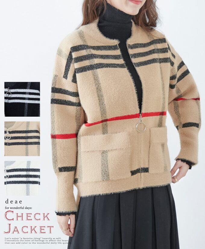 アウター ジャケット 羽織り ジップアップ 上品 チェック ふわふわ もこもこ 起毛 ニット カジュアル 綺麗め レディース ファッション「上品チェックのふわもこジャケット」【da10179】 | deae