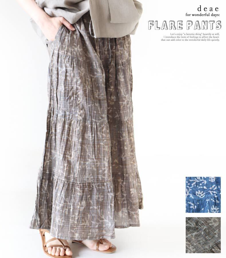 ワイドパンツ ティアード フレアパンツ レディース 夏 春 ファッション オリエンタル エスニック アジアン カジュアル お洒落 可愛い カーキブラウン ネイビー「エスニックな雰囲気を楽しむ ティアード フレアパンツ」【dc10115】 | deae