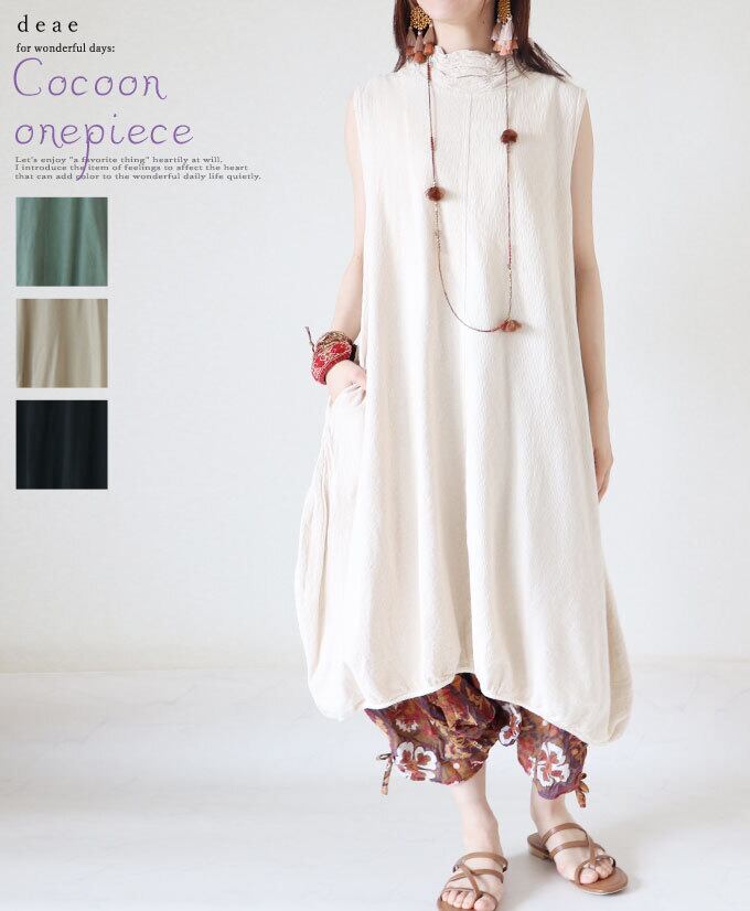 ワンピース ノースリーブ コクーン オフネック オフホワイト ブラック セージ コットン 綿100 レディース 夏 春 秋ファッション 大人ナチュラル カジュアル「風合いの良いナチュラルなコットン オフネックのコクーンワンピース」【da10135】 | deae