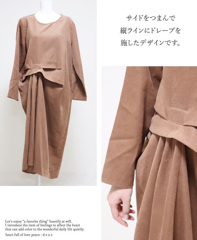 DEAE ワンピース アシンメトリー 長袖 ミディアム丈 ミモレ丈 大人ナチュラル 上品 カジュアル ブラウン 「サイドタックでつくる ドレープが美しい ナチュラルワンピース」【db10125】 | deae