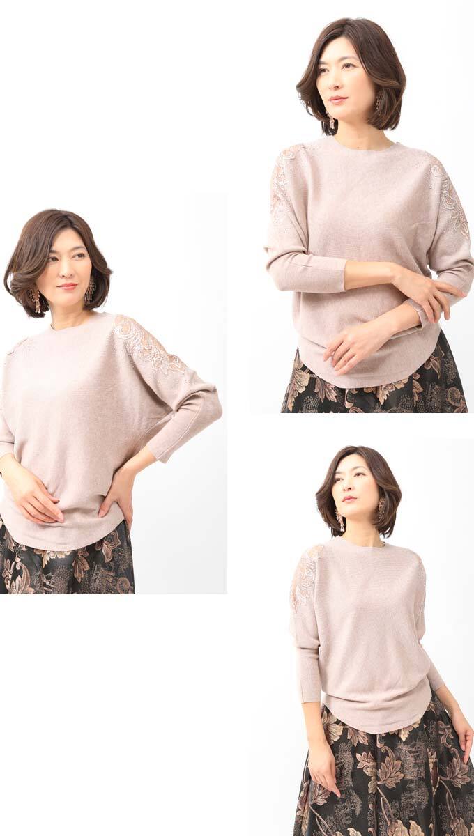 トップス ニット 袖レース 肩レース 繊細レース 透け袖 シアー袖 ドルマンスリーブ カジュアル レディース ファッション「繊細な立体花刺繍袖が大人可愛い ふんわり袖のニットトップス」【da10151】 | deae