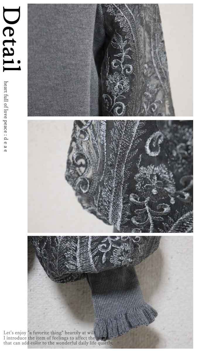 トップス ニット 袖レース 透けレース 繊細レース 透け袖 シアー袖 ふんわり袖 カジュアル レディース ファッション「繊細な透けレース刺繍がエレガント ぱっと華やぐニットトップス」【da10153】 | deae