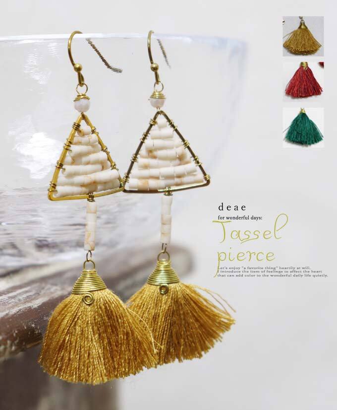 ピアス 金属アレルギー対応 ビジュー タッセル ハンドメイド 手作り エスニック トライバル 大人ナチュラル オリエンタル レディース ファッション 春 夏 秋 冬 オールシーズン 「揺れる三角と ぷっくりタッセルのピアス」【dz10200】 | deae