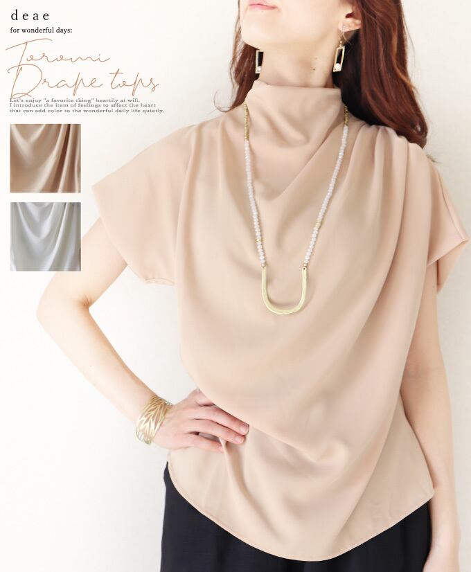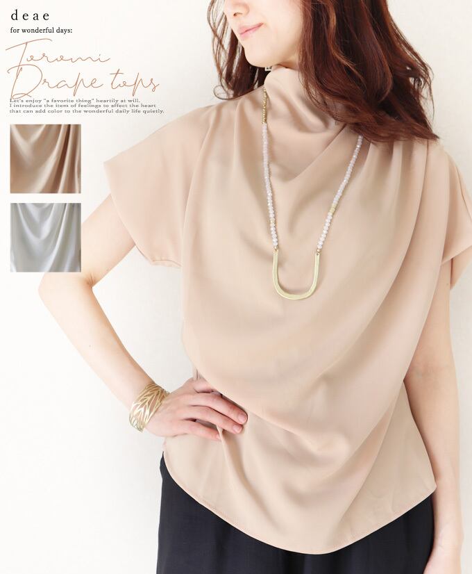 トップス ミドル丈 半袖 レディース ファッション 春 夏 秋 モード 綺麗め 着回し力 シンプル カジュアル オフネック ハイネック とろみ 艶めき ドレープ「光を程よく映して艶めく 美しいドレープのトップス」【da10187】 | deae