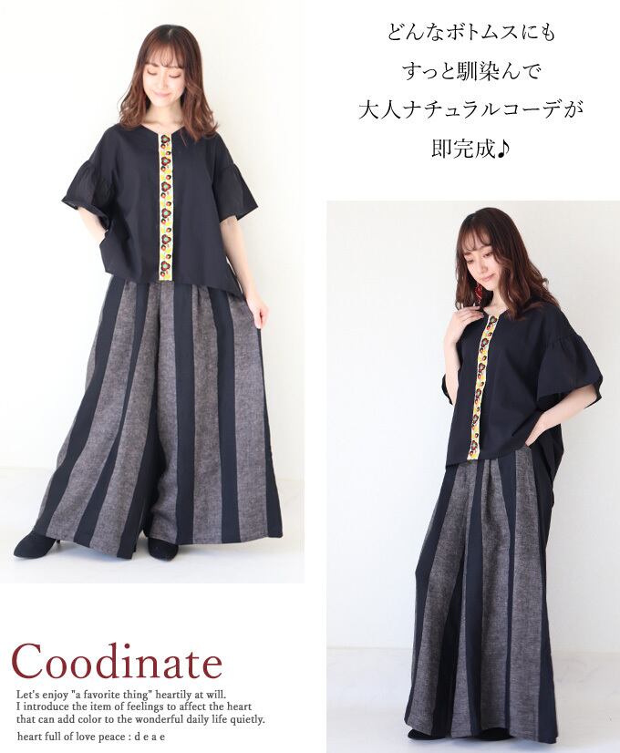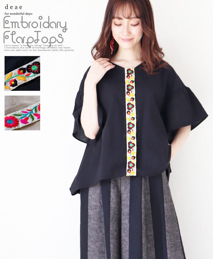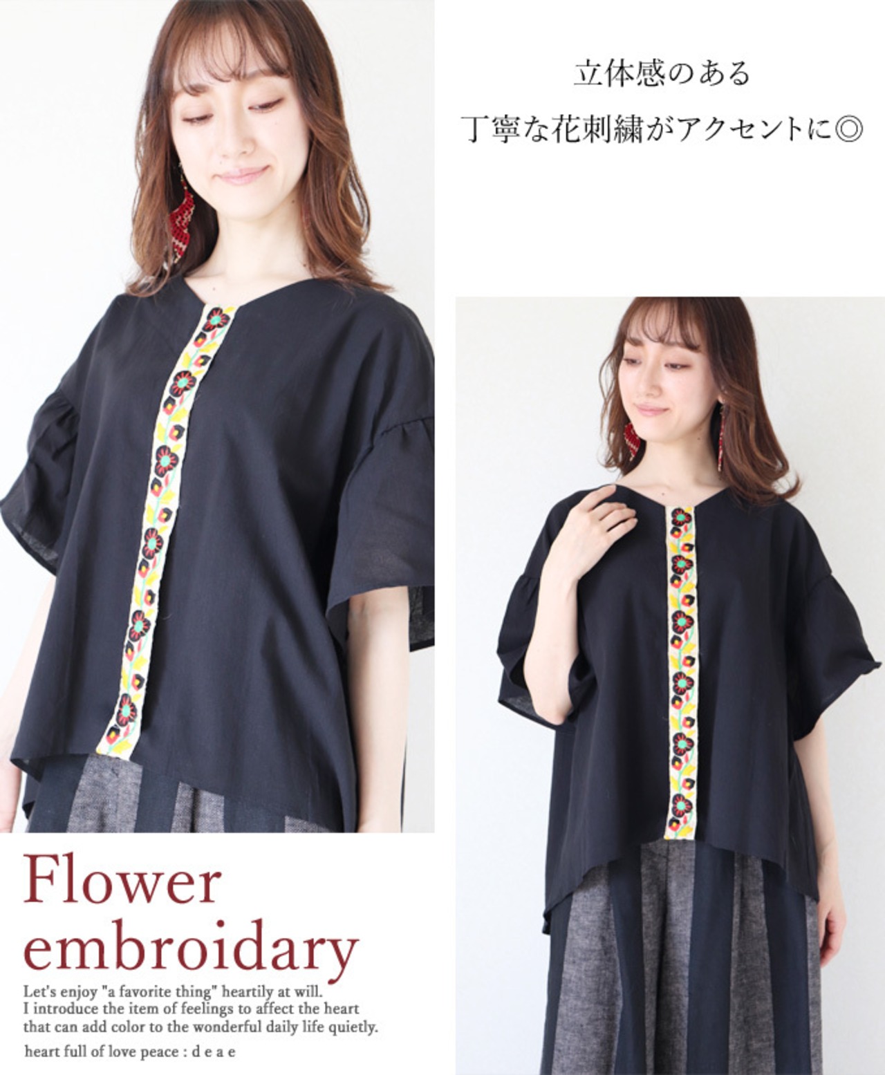 トップス ミドル丈 五分袖 花刺繍 チロリアン レディース ファッション 春 夏 秋 大人ナチュラル カジュアル エスニック 着回し力 「ぷっくり花刺繍の ふんわりフレア袖トップス」【da10189】 | deae