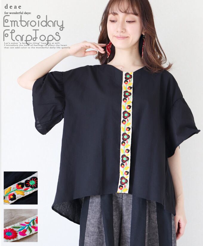 トップス ミドル丈 ペプラム ふんわり袖 花刺繍 チロリアン バックリボン 後ろリボン レディース ファッション 春 夏 秋 カジュアル 綺麗め 着回し力 「華やかな花刺繍リボンがアクセント ふんわり袖の上品ペプラムトップ」【da10190】 | deae