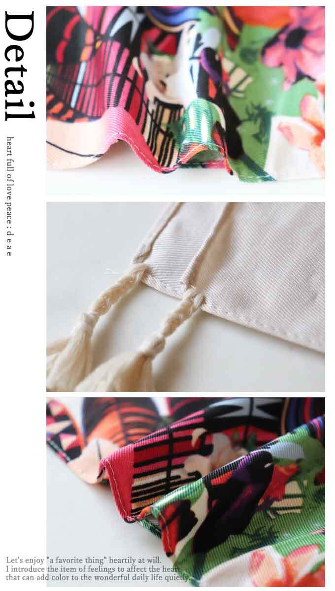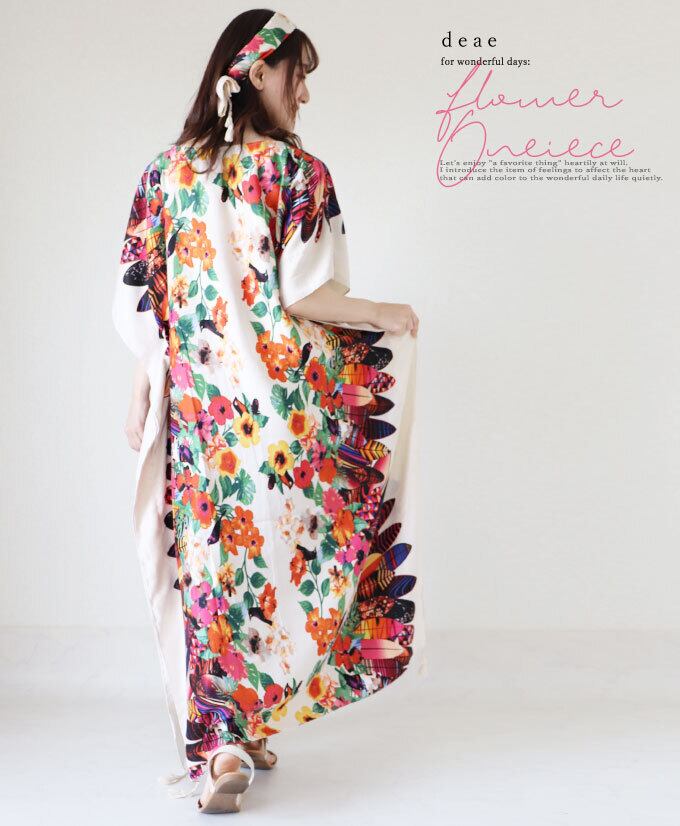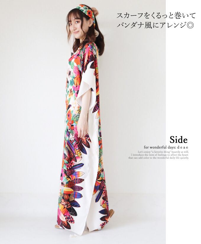 ワンピース 花柄 フェザー 羽柄 彩り 華やか ドルマン 5分袖 ゆったり スカーフ付き レディース ファッション 大人ナチュラル カジュアル お洒落 可愛い 上品「纏うだけで一気に着映える 彩り豊かな花柄ワンピース」【db10133】 | deae