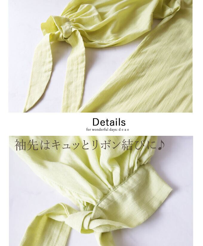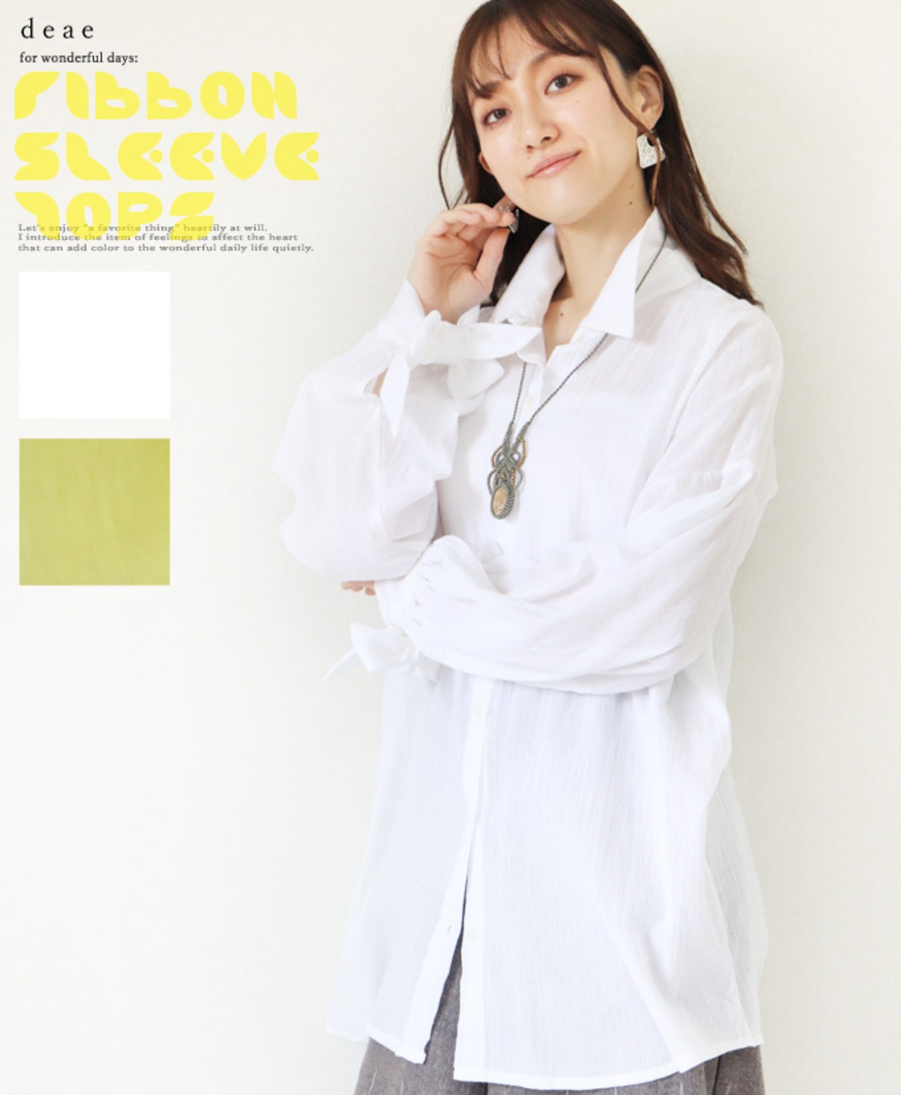 シャツ ブラウス ミドル丈 ふんわり袖 リボン袖 レディース ファッション 春 夏 秋 長袖 カジュアル 爽やか「爽やかカジュアル 上品なふんわり袖リボンが大人可愛い 着回しトップス」【da10202】 | deae