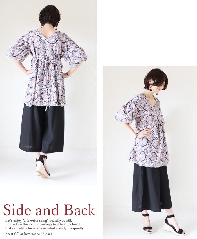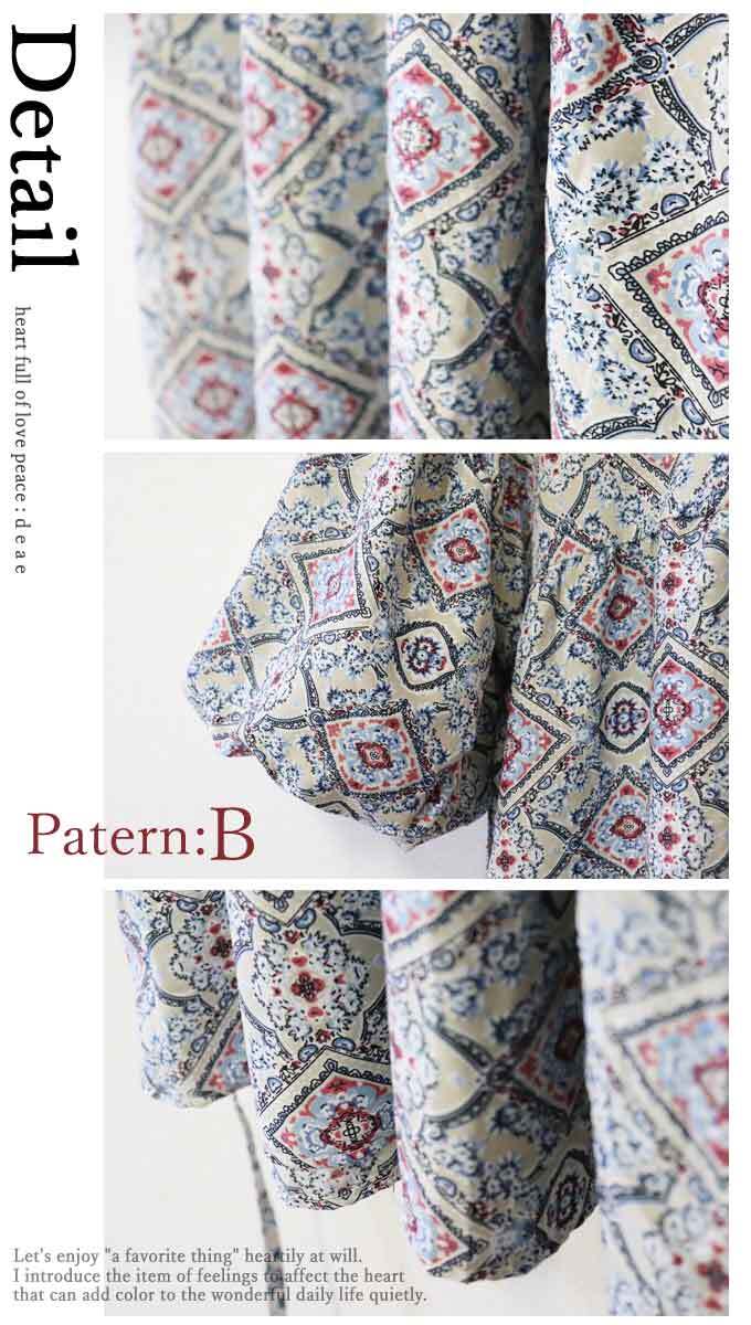 トップス 五分袖 ふんわり袖 バルーン袖 ボリューム袖 Vネック レディース ファッション 春 夏 秋 エスニック オリエンタル 大人ナチュラル モザイク柄 モロッコ「ふんわり五分袖 フェミニンなエスニック柄プルオーバー」【da10225】 | deae