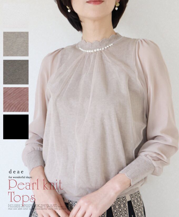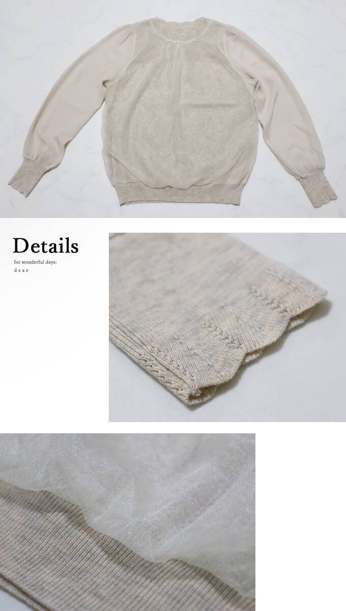 トップス ニット 長袖 カットソー プルオーバー 袖シフォン 透け袖 シアー袖 ふんわり袖 カジュアル 上品 パール レディース ファッション「ネックレスいらずで凛と華やぐ 連なるパールのニットトップス」【da10237】 | deae