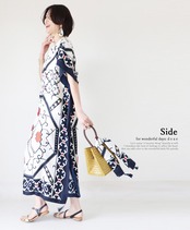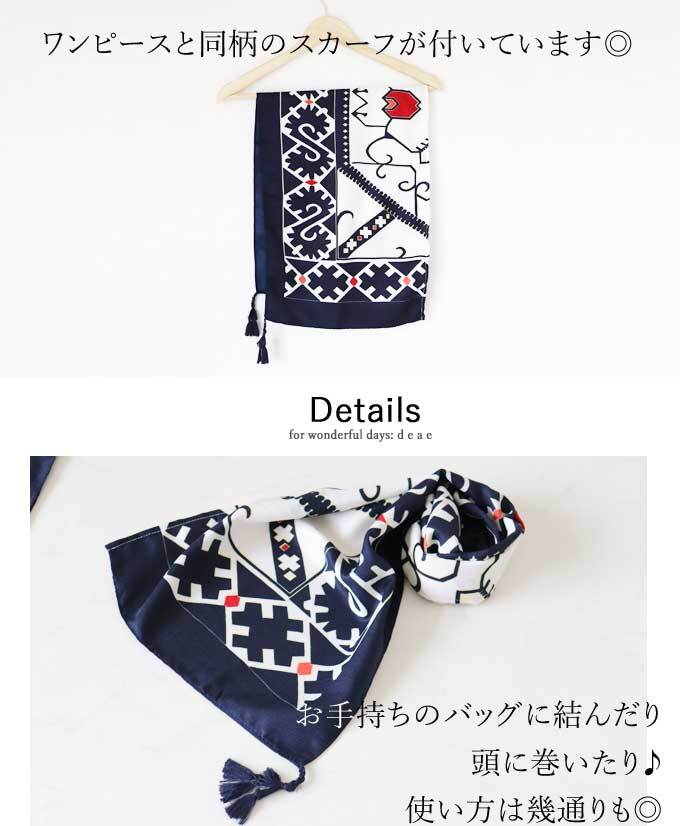 ワンピース オリエンタル エスニック スカーフ柄 ドルマンスリーブ 5分袖 ゆったり レディース ファッション 大人ナチュラル カジュアル 「パッと華やぐオリエンタルなスカーフ柄 優雅なドルマンワンピース 同柄のスカーフ付き」【db10144】 | deae