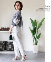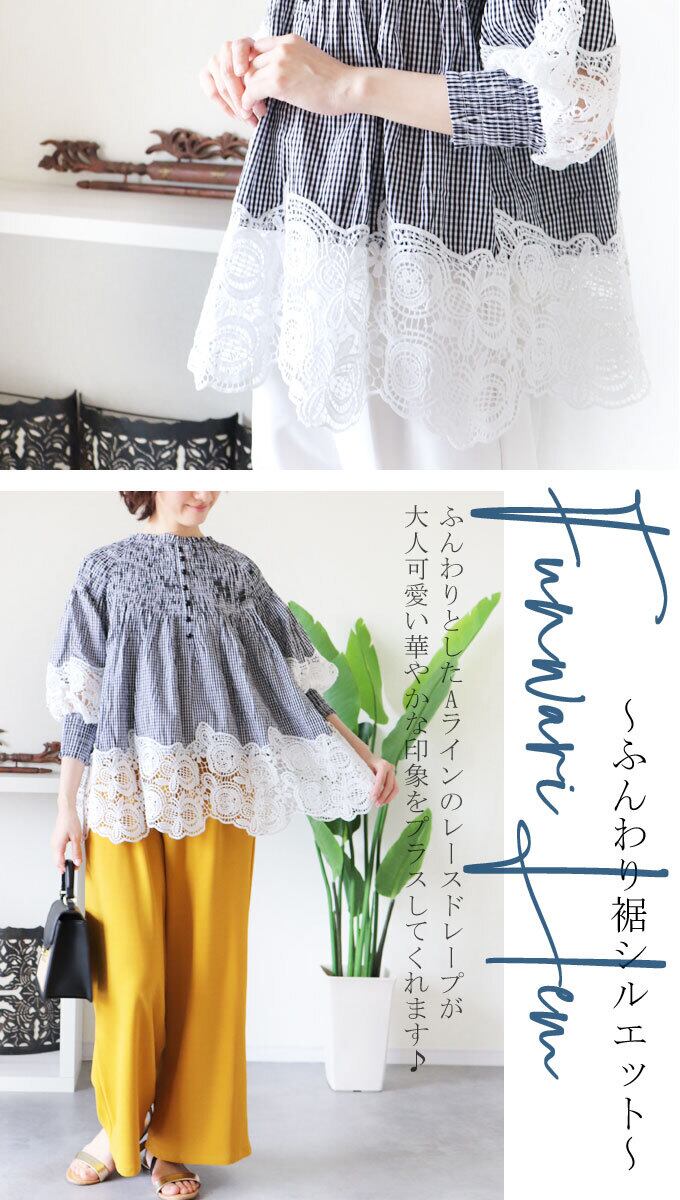 トップス レディース 7分袖 パフスリーブ ギンガムチェック 春 夏 秋 ホワイト ブラック 黒 白 花レース 上品 大人可愛い【da10254】30代 40代 50代 60代 7分袖 ふんわり袖 二の腕カバー 体型カバー 綺麗め カジュアル | deae