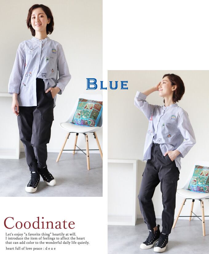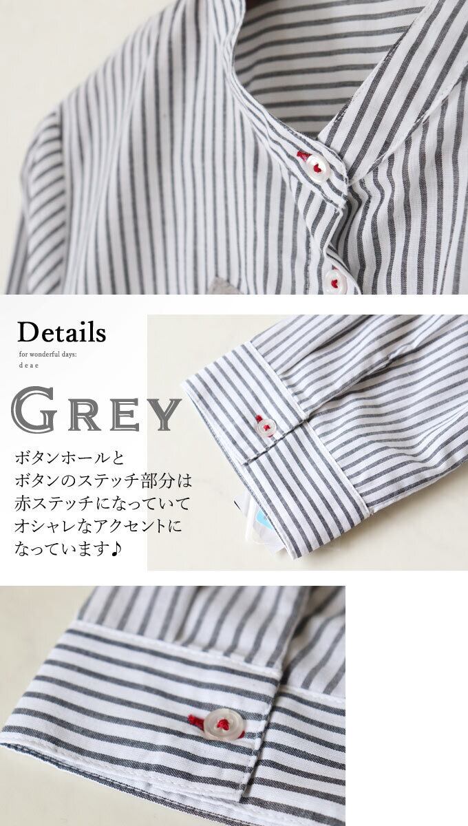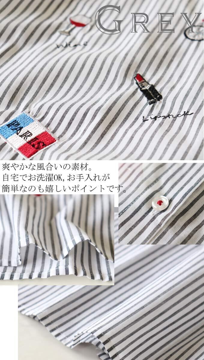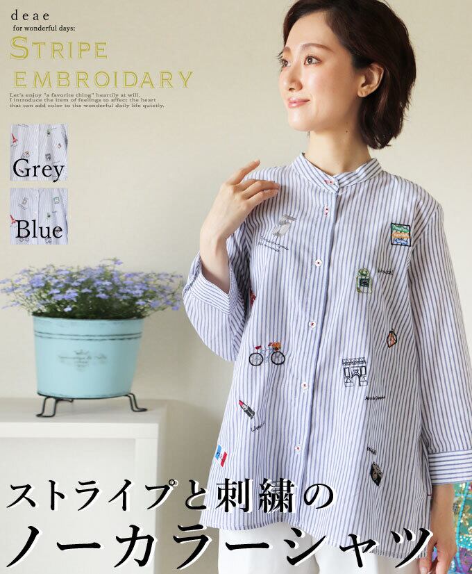 トップス レディース 7分袖 ストライプ 刺繍 ノーカラーシャツ 春 夏 秋 カジュアル 綺麗め ブラウス上品 大人可愛い ゆったり【da10241】 30代 40代 50代 60代 7分袖 体型カバー 綺麗め カジュアル | deae