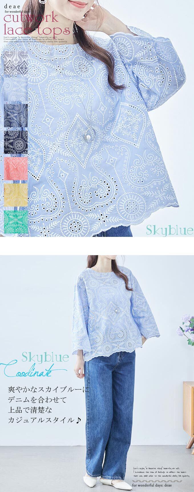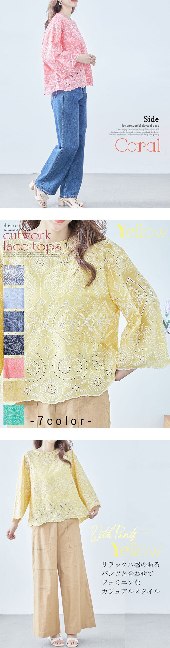トップス レディース 7分袖 フレア袖 カットワーク レース カットソー プルオーバー 春 夏 秋 カジュアル 綺麗め 花レース 上品 大人可愛い【da10255】30代 40代 50代 60代 7分袖フレア 二の腕カバー 体型カバー 綺麗め カジュアル ホワイト スカイブルー クラシックブルー ネイビー コーラル イエロー エメラルド | deae