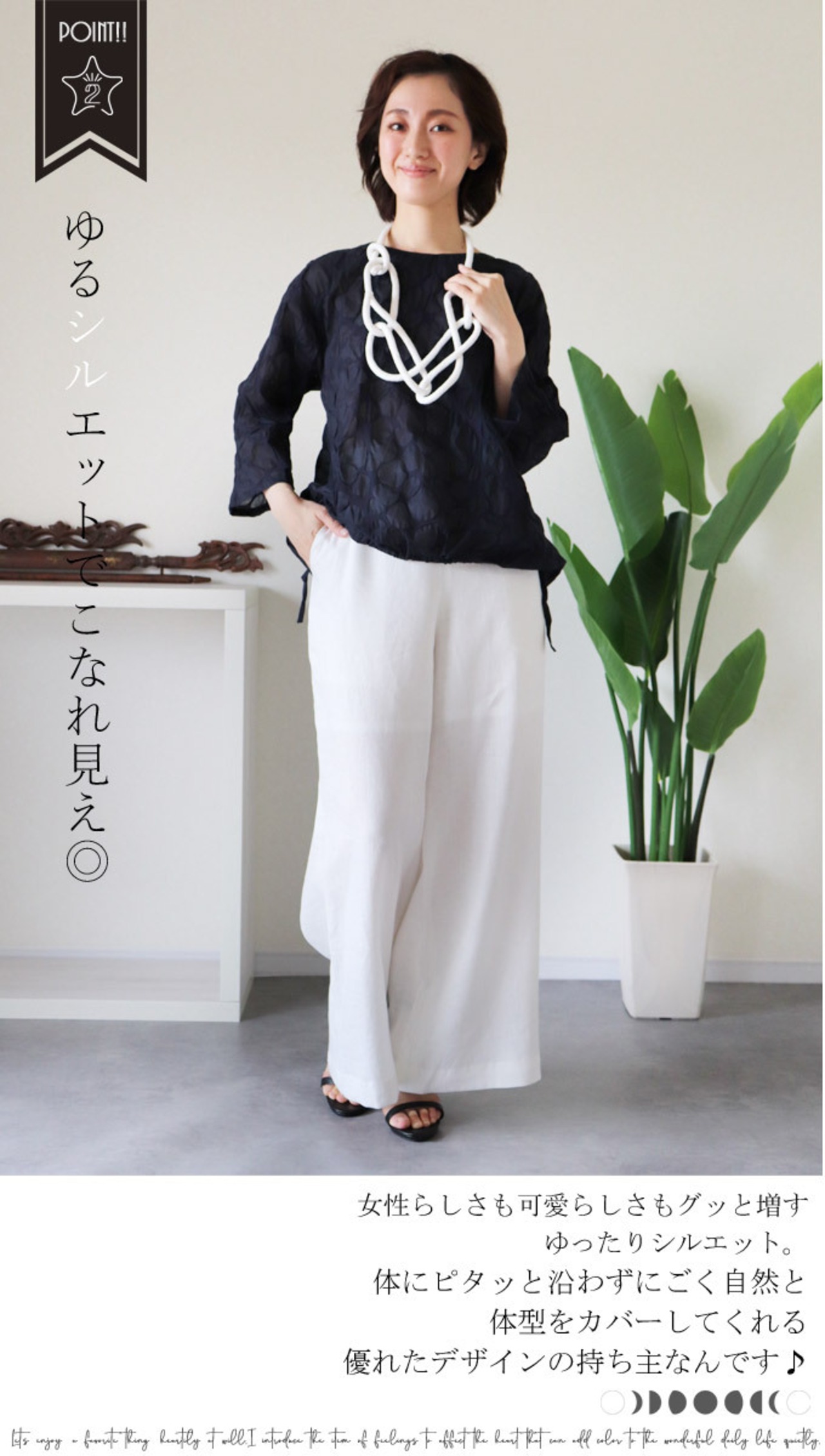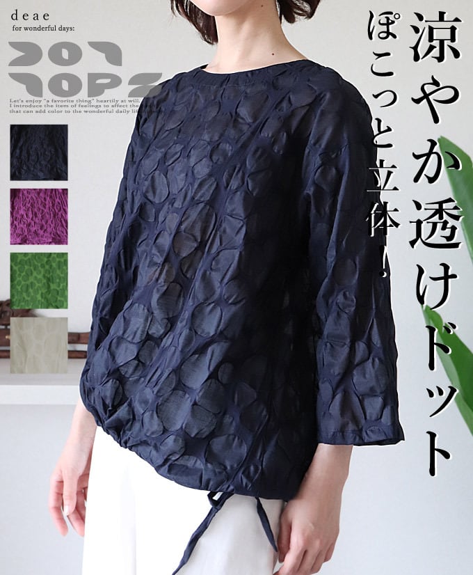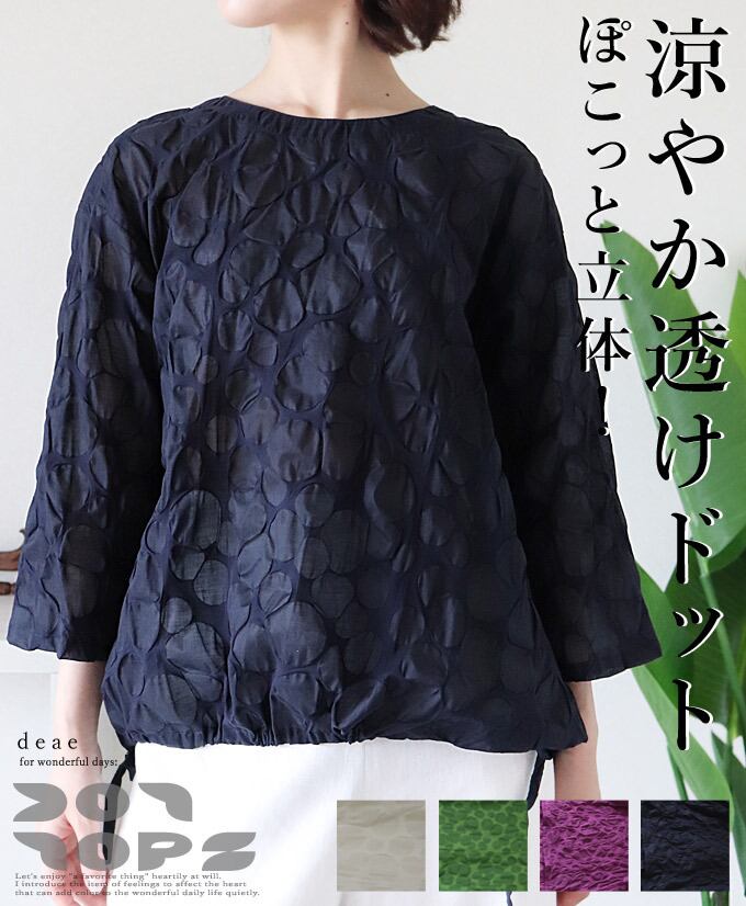 トップス レディース 7分袖 水玉 ドット 透けドット シアー 裾ブラウジング ふんわり 春 夏 秋 カジュアル 綺麗め オフホワイト ブラック グリーン パープル 上品 大人可愛い【da10242】30代 40代 50代 60代 7分袖フレア 二の腕カバー 体型カバー 綺麗め カジュアル | deae