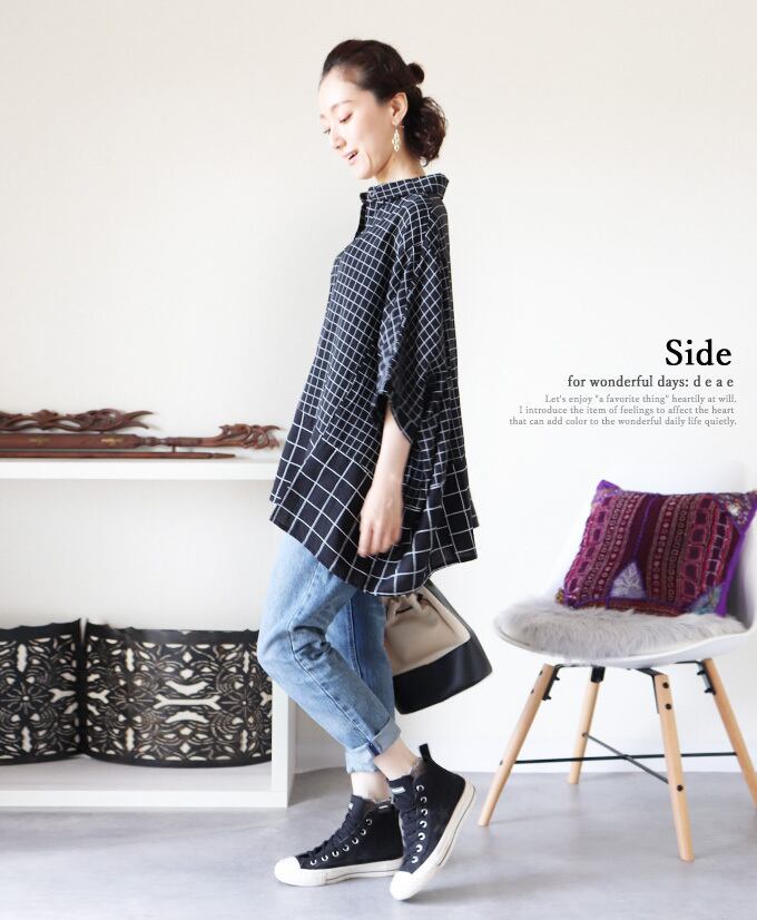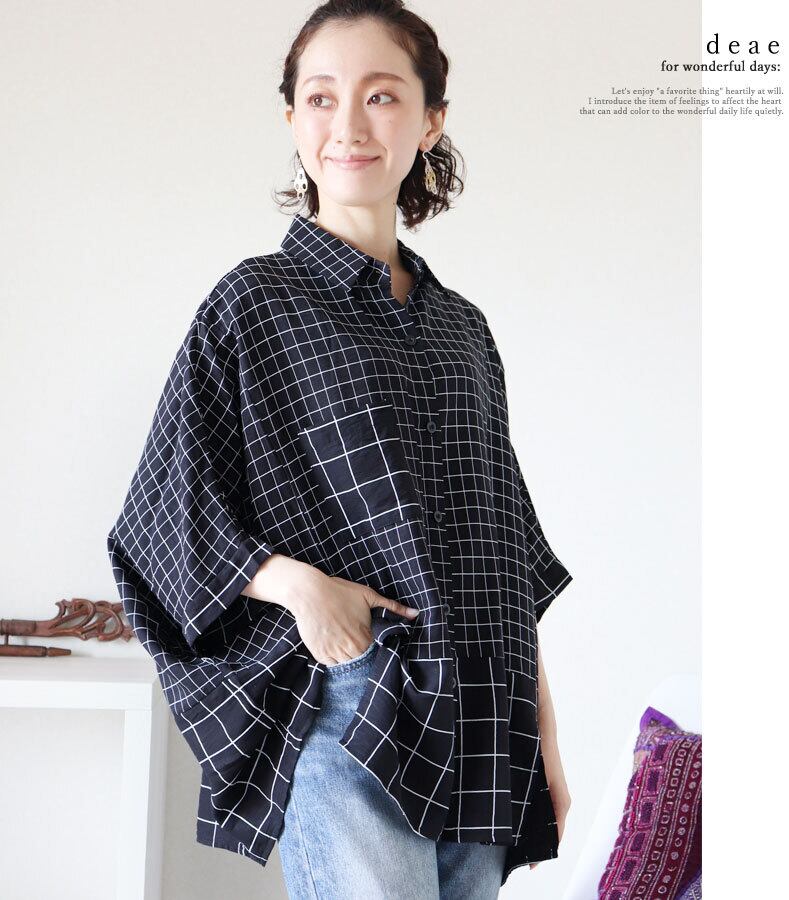 シャツ ブラウス トップス レディース チェック ウィンドウペン ドルマンスリーブ カジュアル モード ゆったり ブラック ホワイト 黒×白 春 夏 秋 「異なるウィンドウペンチェックがドッキング モードなドルマンシャツ」【da10258】30代 40代 50代 60代 チェック カジュアル ブラウス シャツ ドルマン | deae