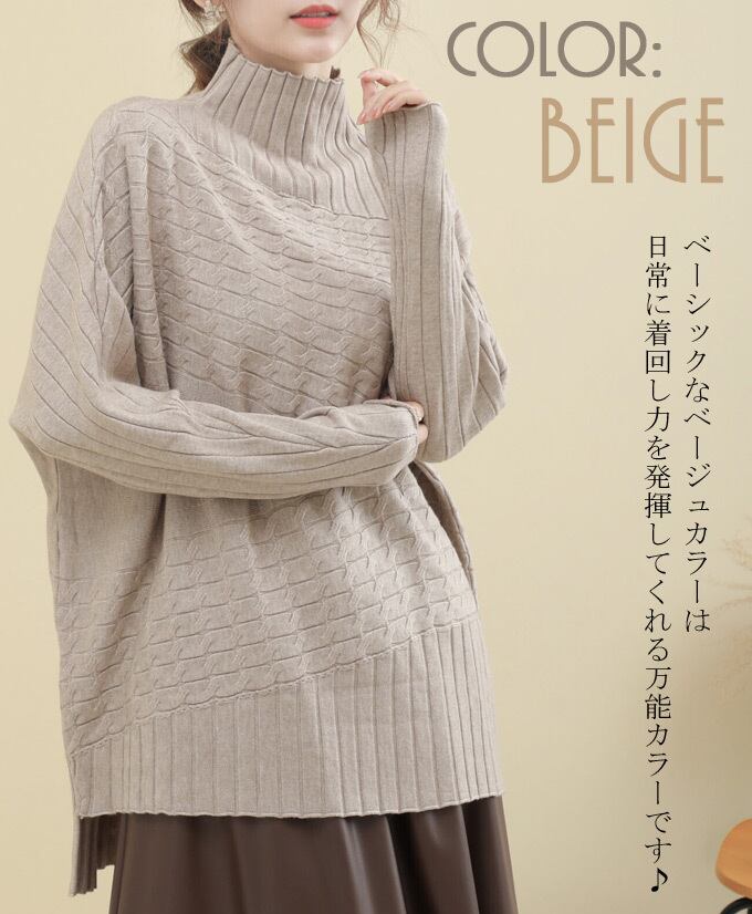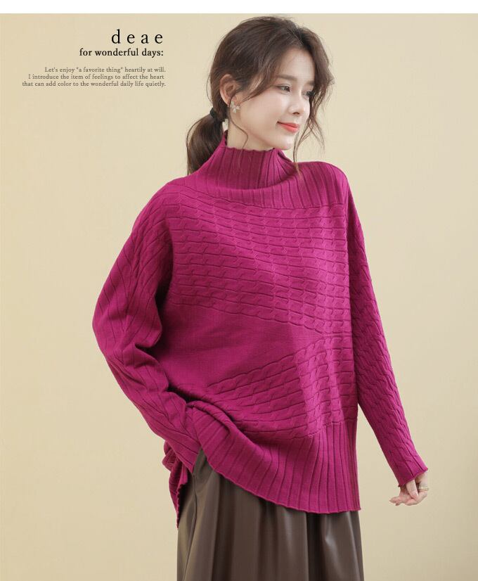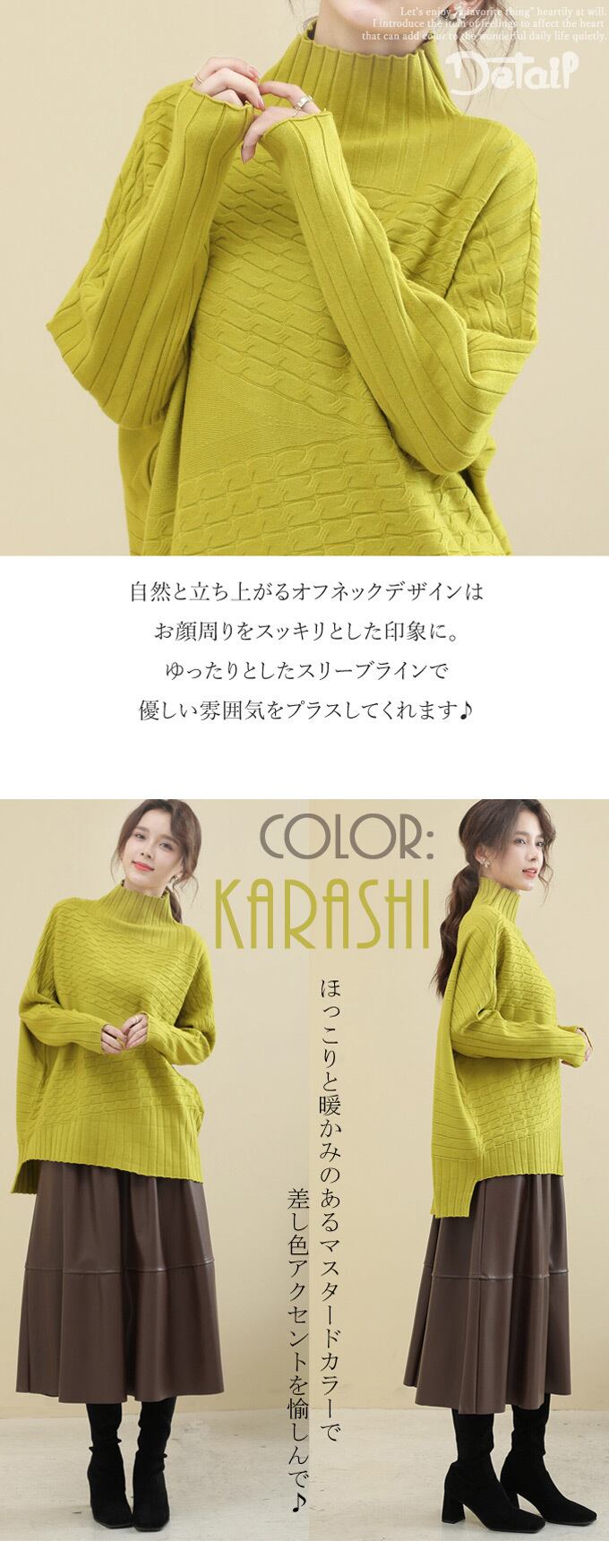 ニット ケーブル ジャガード オフネック 切り替えデザイン 後ろ下がり 長袖 プルオーバー 綺麗め カジュアル 上品「綺麗めにもカジュアルにも 着回し力の効くジャガードニットのプルオーバー」【da10266】30代 40代 50代 60代 ニット カットソー ゆったり プルオーバー ブラック ベージュ グレー チェリー ピンク からし マスタード グリーン ブルー | deae